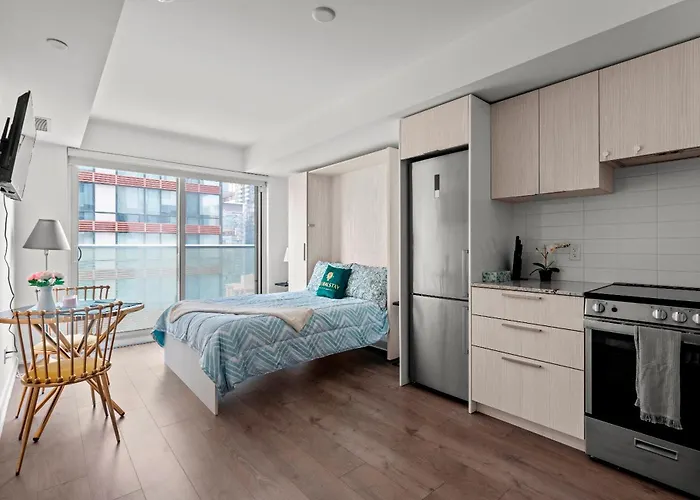 公寓是在多伦多的多伦多市中心区,距离比利-畢曉普多倫多市機場机场有15分钟车程。 它靠近瑞尔森大学。公寓距离韋斯里站地铁站700米。 住所距离安大略美术馆只有一箭之地了,步行仅20分钟就到了。 圣劳伦斯市场距离公寓仅几步之遥。